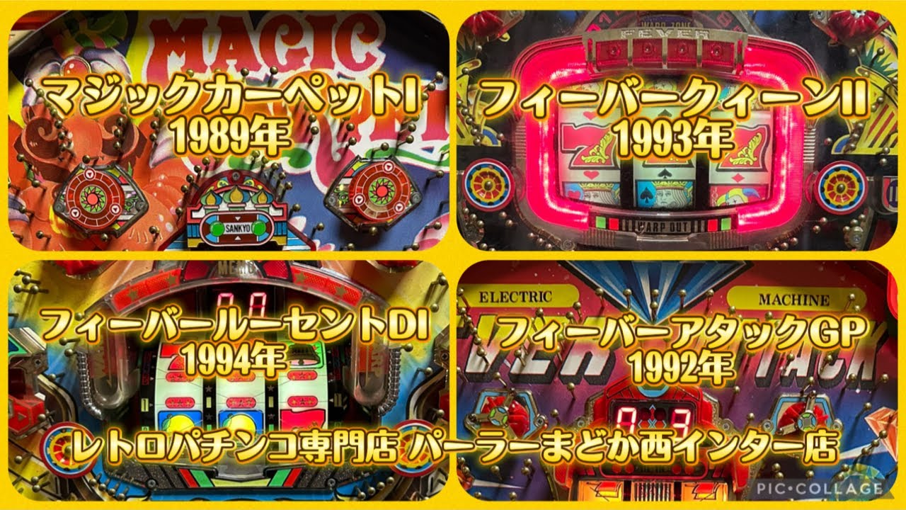 マジックカーペットI 1989年、フィーバールーセントDI1994年、フィーバーアタックGP1992年、フィーバークィーンII1993年【レトロパチンコ専門店 パーラーまどか西インター店】 レトロパチンコ Twitter Facebook はてブ Pocket LINE コピー 2025.09.21
